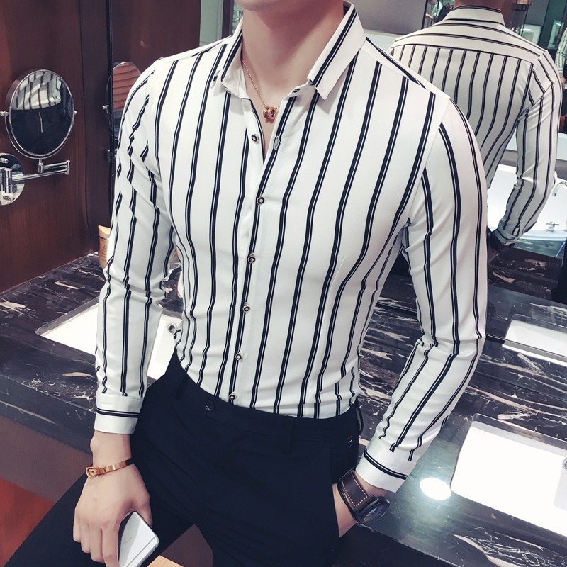 Jual Korean Striped Shirt Men Slim Fit Vintage Vertical Stripe Shirt Men Long Sleeve Camisa Shopee Indonesia